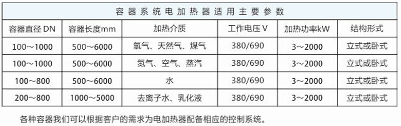 容器系統(tǒng)加熱由于電熱元件采用集成式管狀電熱元件,直接侵入氣體、液體中。熱量集中,熱響應(yīng)快,熱效率高加熱溫度可達(dá)650°,壽命長(zhǎng),可靠性高,廣泛用于各種氣體、液體加熱,一定壓力下粉末干燥,化工過(guò)程及噴射干燥,蒸汽(過(guò)熱蒸汽)加熱。氣體加熱包括天燃?xì)?、氫氣、氮?dú)庖约案鞣N惰性氣體。碳?xì)浠衔锛訜岚▽?dǎo)熱油、稠油燃料油、瀝青、石蠟、乳化液等。公司除加熱普通場(chǎng)合下的容器系統(tǒng)加熱器,還可以設(shè)計(jì)制造BT/CT防爆等級(jí)電加熱器。常用實(shí)例見(jiàn)下表: